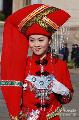 3月5日上午,是十一屆全國(guó)人大二次會(huì)議在人民大會(huì)堂內(nèi)開幕的時(shí)間,會(huì)場(chǎng)內(nèi)代表委員們?yōu)闇乜偫砭实恼ぷ鲌?bào)告鼓掌喝彩,會(huì)場(chǎng)外人民大會(huì)堂東側(cè)門口的廣場(chǎng)上也因這些姑娘們的出現(xiàn)而光彩靚麗。她們是此次大會(huì)的壯族禮儀姑娘們,她們有著與60年共和國(guó)的旗幟一樣的色彩——中國(guó)紅!
