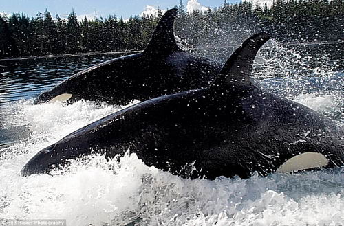 殺人鯨水中群舞。攝影師奧爾夫-?嗽诩幽么鬁馗缛A附近海域拍下了三頭野生殺人鯨(學(xué)名為虎鯨)在水中群舞的照片。