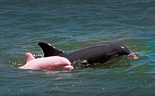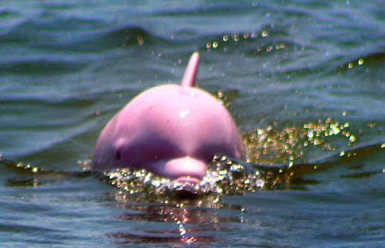 粉紅色海豚在水中嬉戲。拍攝地點(diǎn)是在美國路易斯安那州的加爾卡修湖,拍攝者是當(dāng)?shù)氐囊幻L,他說這只粉紅色的小寬吻海豚甚至還擁有淡紅色的眼睛。這只海豚也可能是世界上唯一一只粉紅色的寬吻海豚。