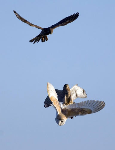 猛禽“空戰(zhàn)”。圖為一只谷倉貓頭鷹在白天覓食時遭到兩只茶隼的伏擊的照片。