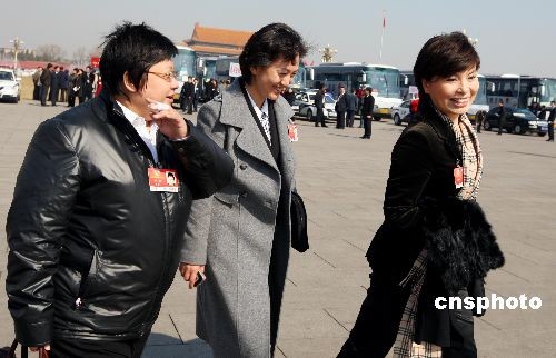 3月8日,眾多女委員在國(guó)際婦女節(jié)當(dāng)日出席全國(guó)政協(xié)十一屆二次會(huì)議第三次全體會(huì)議。圖為央視女主持人李瑞英、海霞和歌星韓紅在會(huì)后輕松步出人民大會(huì)堂。中新社發(fā) 楊可佳 攝