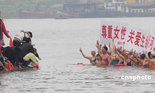 圖:南寧冬泳愛(ài)好者游邕江慶祝三八節(jié)