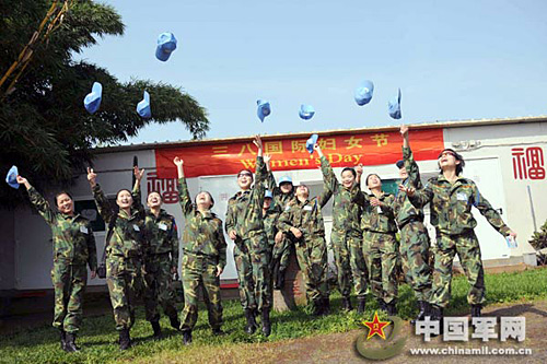 3月8日,中國第九批赴剛果(金)維和醫(yī)療分隊(duì)的女隊(duì)員在剛果(金)東部城市布卡武的維和軍營歡慶三八國際婦女節(jié)。中國第九批赴剛果(金)維和醫(yī)療分隊(duì)共12名女隊(duì)員,全部來自蘭州軍區(qū)駐陜西的軍隊(duì)醫(yī)院。
