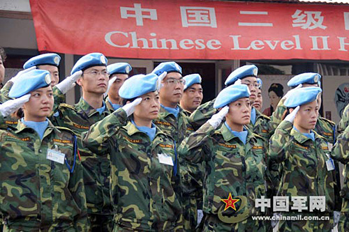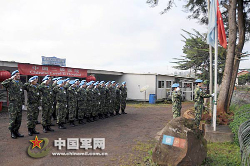 中國第九批赴剛果(金)維和醫(yī)療分隊舉行升國旗儀式,紀(jì)念三八國際婦女節(jié)。武國強(qiáng) 攝