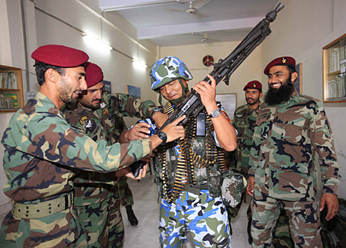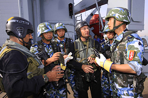 中國海軍特戰(zhàn)隊(duì)員(中)參加“和平—09”多國海上聯(lián)合軍演時與巴基斯坦海軍特戰(zhàn)隊(duì)員交流。