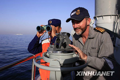 3月9日,在巴基斯坦南部卡拉奇港附近的阿拉伯海舉行的“和平-09”海上多國聯(lián)合軍事演習實兵演練中,澳大利亞海軍觀察員(右)在中國海軍“廣州”號驅逐艦上觀摩演習。查春明 攝