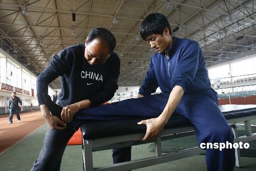 3月10日上午, 劉翔在上海莘莊基地開始進(jìn)行正式訓(xùn)練。由于剛剛恢復(fù)傷勢(shì),劉翔并沒有穿上釘鞋,進(jìn)行跨欄訓(xùn)練,只是在場(chǎng)邊做恢復(fù)性練習(xí)。圖為教練孫海平(左)在幫劉翔拉韌帶。 中新社發(fā) 湯彥俊 攝