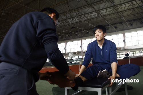 3月10日上午, 劉翔在上海莘莊基地開始進行正式訓練,在訓練間隙,孫海平教練用一塊海綿來幫助訓練劉翔右腳的靈敏性。孫海平教練表示:由于劉翔的傷勢剛剛恢復,右腳踝關(guān)節(jié)力量還不夠,用海綿訓練是為了增加劉翔右腳踝的靈活性。”中新社發(fā) 湯彥俊 攝