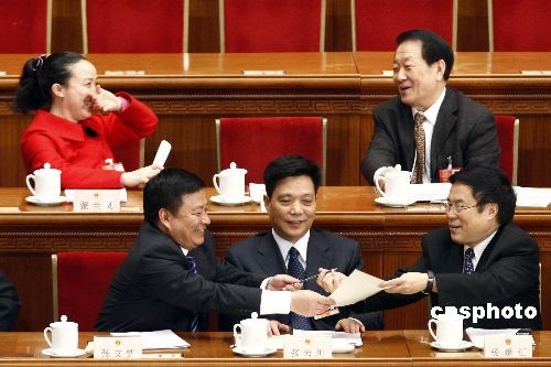 3月10日,第十一屆全國(guó)人民代表大會(huì)第二次會(huì)議在人民大會(huì)堂舉行第三次全體會(huì)議,聽取最高人民法院院長(zhǎng)王勝俊作最高人民法院工作報(bào)告;聽取最高人民檢察院檢察長(zhǎng)曹建明作最高人民檢察院工作報(bào)告。圖為會(huì)議開始前已在主席臺(tái)就坐的人大代表交談。中新社發(fā) 盛佳鵬 攝