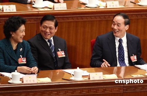 3月10日,第十一屆全國人民代表大會(huì)第二次會(huì)議在人民大會(huì)堂舉行第三次全體會(huì)議,最高人民法院院長王勝俊、最高人民檢察院檢察長曹建明分別作工作報(bào)告。國務(wù)院副總理王岐山(右)、北京市委書記劉淇(中)、國務(wù)委員劉延?xùn)|在主席臺(tái)上交談。中新社發(fā) 杜洋 攝