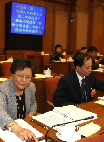 3月12日上午,十一屆全國人大二次會(huì)議第三次主席團(tuán)會(huì)議在北京人民大會(huì)堂舉行。會(huì)議經(jīng)過表決,決定將關(guān)于全國人大常委會(huì)工作報(bào)告的決議草案、關(guān)于最高人民法院工作報(bào)告的決議草案、關(guān)于最高人民檢察院工作報(bào)告的決議草案提請(qǐng)各代表團(tuán)審議。圖為主席團(tuán)成員范徐麗泰按表決器。中新社發(fā) 任晨鳴 攝