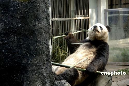 三月十二日,去年從四川地震災區(qū)轉移到福州的大熊貓在福州熊貓世界里,躺在明媚陽光下,悠閑地吃著竹子。中新社發(fā) 王東明 攝