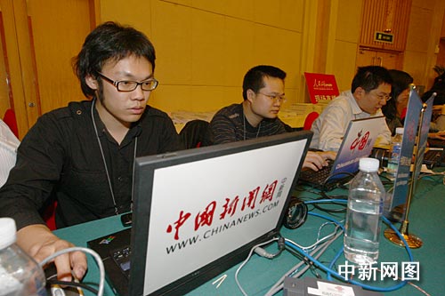 3月12日下午,十一屆全國(guó)人大二次會(huì)議新聞中心舉行“文化市場(chǎng)與文化產(chǎn)業(yè)發(fā)展”專題采訪,中新網(wǎng)記者現(xiàn)場(chǎng)工作。中新社發(fā) 杜洋 攝
