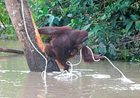 馬來西亞婆羅洲島東北端的一條河流不久前發(fā)生了洪水,一只紅毛猩猩媽媽和她的幼子被困在樹上進退兩難,它們已被困在那里好幾天了。世界自然基金會派遣一個救援小組前往該地區(qū),搭建了一個索橋,使他們能夠靠近這對饑餓的猩猩母子。救援人員想出了一個妙招,他們將一根繩子扔給猩猩媽媽,希望她能抓牢這根繩子游到最近的岸上。但是救援人員十分擔心,猩猩媽媽會因為怕水拒絕抓住繩子游到岸邊。出人意料的是,母猩猩從樹上爬下來,背著孩子毫不猶豫地跳進洶涌的洪水中,她手里抓著繩子,并確保猩猩幼子的頭部露在水面上,奮力游向河岸,終于安全到達岸上。