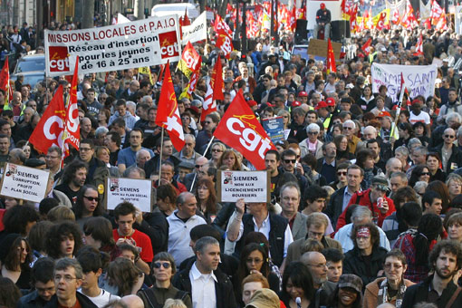 3月19日法國各大工會在全國各地聯(lián)合組織罷工和示威游行等活動,抗議政府在應(yīng)對當前經(jīng)濟危機過程中忽視勞動者權(quán)益和社會福利。