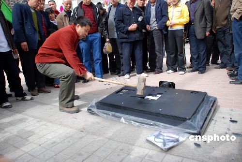 組圖:新疆一消費(fèi)者街頭怒砸彩電(2)
