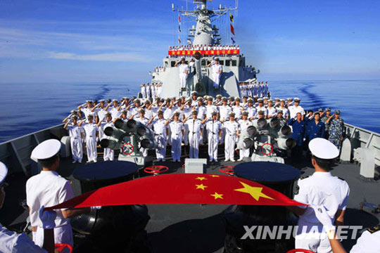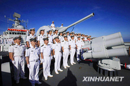 “廣州”艦全體官兵日前在巴基斯坦舉行的“和平-09”多國聯(lián)合軍事演習(xí)中出色完成了各項演習(xí)任務(wù),充分展示了中國海軍威武之師、文明之師、和平之師和勝利之師的良好形象,促進了與參演各國海軍的交流與合作,增進了中巴兩國、兩軍的互信與友誼。