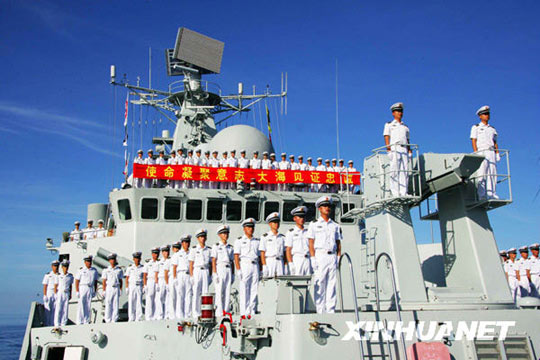 “廣州”號(hào)導(dǎo)彈驅(qū)逐艦跨越祖國(guó)傳統(tǒng)海疆線,回到祖國(guó)懷抱,艦上全體官兵在南海舉行回歸祖國(guó)儀式。