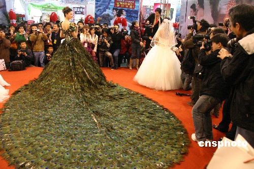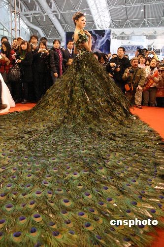 2009年3月28日,為期三天的“中國(guó)2009南京首屆婚慶文化博覽會(huì)暨長(zhǎng)三角婚慶高端品牌嘉年華”在南京國(guó)際展覽中心開(kāi)幕,在婚博會(huì)上亮相的一件價(jià)值999.9萬(wàn)元的“玉羽云”讓參觀者大飽眼福。據(jù)悉,這件“玉羽云”由78歲的蘇繡大師顧文霞設(shè)計(jì),用2009片天然孔雀羽毛、南京云錦、蘇繡制作而成,并以60粒和田玉作為配飾,由8位工作人員利用40天時(shí)間創(chuàng)作而成。