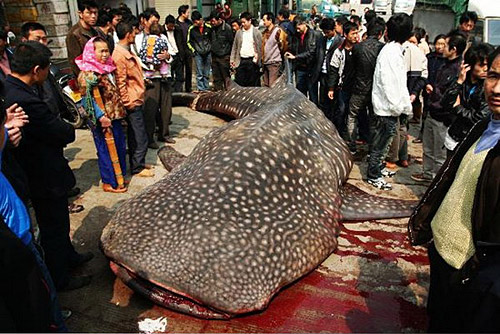 4月1日上午,在福建石獅祥芝水產(chǎn)品批發(fā)市場一塊空曠的地面上一市民稱有漁民捕獲了一條重達(dá)兩三噸的大鯊魚,已送到祥芝水產(chǎn)品批發(fā)市場販賣。