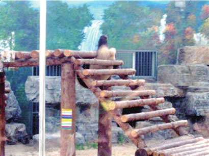 沒想到,正當(dāng)游客們?yōu)椤氨焕А毙茇堉睍r,那只熊貓自己蕩了幾下,試圖抓住木梯的架子做支撐。嘗試了幾次后,熊貓突然用力一起身,抓住木架的平臺,從木梯縫隙中抽出肥碩的身體,順著欄桿爬了下來。胡先生說,整個過程不到5分鐘,“很可愛,沒想到它圓嘟嘟的卻挺靈活”。成功“自救”的大熊貓似乎驚魂未定,下了木架后就坐到石頭后“安神”。游客見到此情景,不禁啞然失笑,為它鳴掌鼓勵。