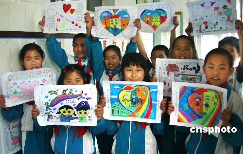 近日,為紀(jì)念“5·12”大地震一周年,山東省淄博市桓臺(tái)縣索鎮(zhèn)中心小學(xué)的小學(xué)生精心制作了512張“心愿卡”,表達(dá)了與災(zāi)區(qū)小朋友心連心的親情。據(jù)了解,這512張心愿卡有的表達(dá)了對(duì)在災(zāi)難中逝去的同胞的緬懷,有的表達(dá)了對(duì)經(jīng)歷災(zāi)難后的小伙伴們的支持與鼓勵(lì),祝愿他們更堅(jiān)強(qiáng)更快樂面對(duì)人生。這批“心愿卡”將通過淄博“重訪四川獻(xiàn)愛心”的志愿者轉(zhuǎn)交到災(zāi)區(qū)小伙伴手中。圖為小學(xué)生們?cè)谡故揪闹谱鞯摹靶脑缚ā薄V行律绨l(fā) 田廷芳 攝