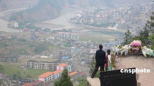 5月10日14時(shí)至5月13日15時(shí),在汶川地震中被摧毀的北川老縣城管制區(qū)域在汶川地震一周年之際再度有限開(kāi)放,方便當(dāng)?shù)厝罕婇_(kāi)展祭奠活動(dòng)。這次解禁范圍僅限于部分區(qū)域,且只針對(duì)北川籍居民入內(nèi)祭奠親人。圖為民眾在北川老縣城的“望鄉(xiāng)臺(tái)”眺望北川。中新社發(fā) 張曉理 攝
