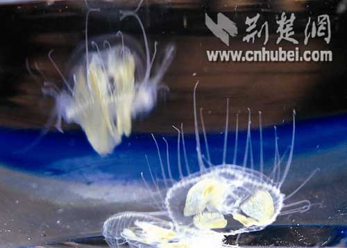 據(jù)介紹,當(dāng)日下午,丹江口市新港村村民陳文新,在漢江中發(fā)現(xiàn)一種硬幣大小、通體晶瑩透亮的生物伸縮漂游,總數(shù)約有4000只。經(jīng)該市水產(chǎn)局副局長(zhǎng)、水產(chǎn)工程師熊治邦現(xiàn)場(chǎng)鑒定,它們是世界極危生物——桃花水母。