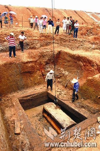 江夏區(qū)博物館館長(zhǎng)劉治云告訴記者,經(jīng)過(guò)連續(xù)的清理發(fā)掘,7日上午終于打開(kāi)存放尸體的內(nèi)棺。記者見(jiàn)到,內(nèi)棺里全部充滿黃泥,考古人員小心翼翼用竹片一點(diǎn)點(diǎn)刮出淤泥,里面摻雜著不少黑色的渣滓和絮狀物,只是發(fā)現(xiàn)一塊玉石樣的物體,是墓主的下頜骨還是隨葬品有待考證。