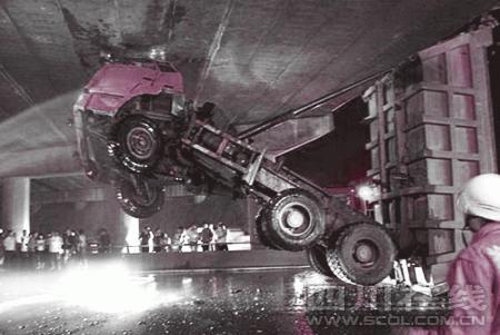 14日晚10時(shí)許,四川樂(lè)山市郊辜李壩立交橋下發(fā)生離奇一幕:一輛雙橋翻斗貨車從橋下穿過(guò)時(shí),車斗突然翻起,將貨車卡在橋下。事故導(dǎo)致貨車上兩人一死一傷,出事路段交通受阻。昨日凌晨2時(shí)許,出事車輛被“取出”并拖離現(xiàn)場(chǎng)。