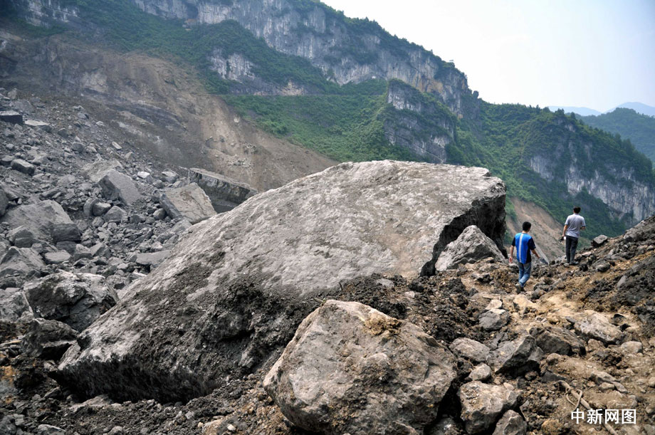 山谷谷底,從山體上垮塌而下的巨石隨處可見,這一塊高達(dá)20余米巨石和其他土石將三聯(lián)采礦場的礦井口掩埋。 曹多然 攝