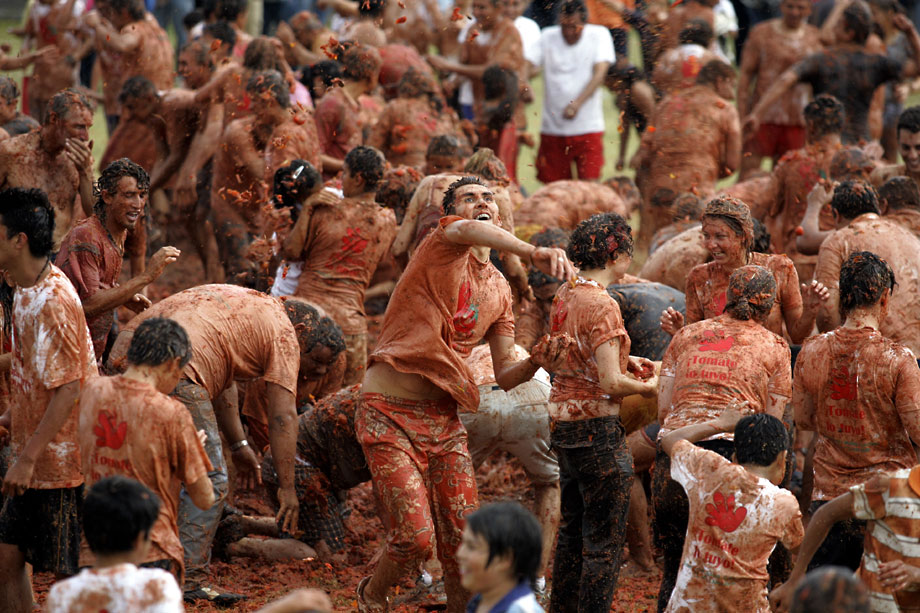 2009年6月14日,哥倫比亞第五屆番茄狂歡節(jié)開(kāi)幕,參與者互相投擲西紅柿,盡情狂歡慶豐收。來(lái)自哥倫比亞各地的狂歡者們?cè)萍谑锥疾ǜ绱髺|北部的蘇塔馬錢小鎮(zhèn),街道上立刻變成了西紅柿紛飛的戰(zhàn)場(chǎng)。雖然每個(gè)人的臉上身上沾滿了西紅柿汁,但人們還是樂(lè)此不疲又是丟又是砸,把成堆的西紅柿當(dāng)成打仗的“武器”。還有人特地穿上白衣白褲,身上越紅,心里就越痛快。