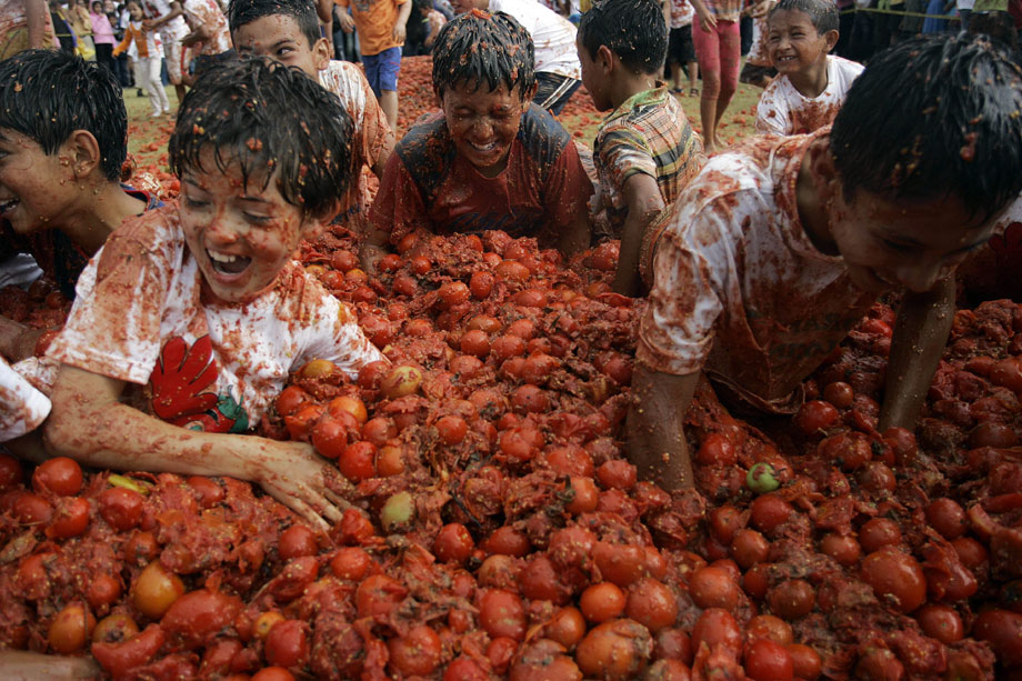 2009年6月14日,哥倫比亞第五屆番茄狂歡節(jié)開(kāi)幕,參與者互相投擲西紅柿,盡情狂歡慶豐收。來(lái)自哥倫比亞各地的狂歡者們?cè)萍谑锥疾ǜ绱髺|北部的蘇塔馬錢小鎮(zhèn),街道上立刻變成了西紅柿紛飛的戰(zhàn)場(chǎng)。雖然每個(gè)人的臉上身上沾滿了西紅柿汁,但人們還是樂(lè)此不疲又是丟又是砸,把成堆的西紅柿當(dāng)成打仗的“武器”。還有人特地穿上白衣白褲,身上越紅,心里就越痛快。