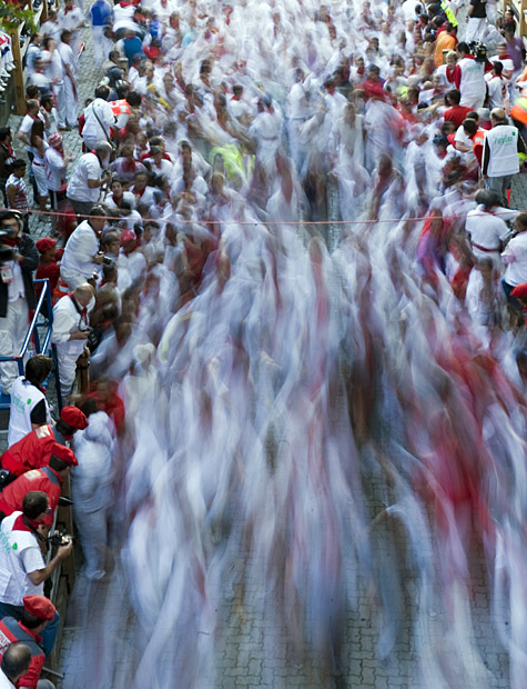 7月8日,在西班牙潘普洛納,參加奔牛節(jié)活動(dòng)的人們躲避猛沖的公牛。