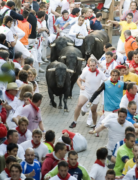 西班牙一年一度的潘普洛納奔牛節(jié)上驚險場面層出不窮。奔牛節(jié)是潘普洛納的傳統(tǒng)節(jié)日,其歷史可以追溯到1591年,每年都吸引數(shù)十萬人參加。