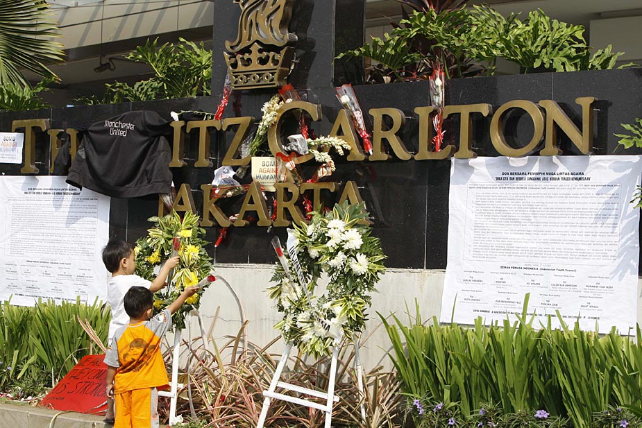 7月18日,印度尼西亞首都雅加達(dá)的民眾紛紛來到發(fā)生爆炸的萬豪酒店和麗嘉酒店,向死難者獻(xiàn)花表示哀悼。