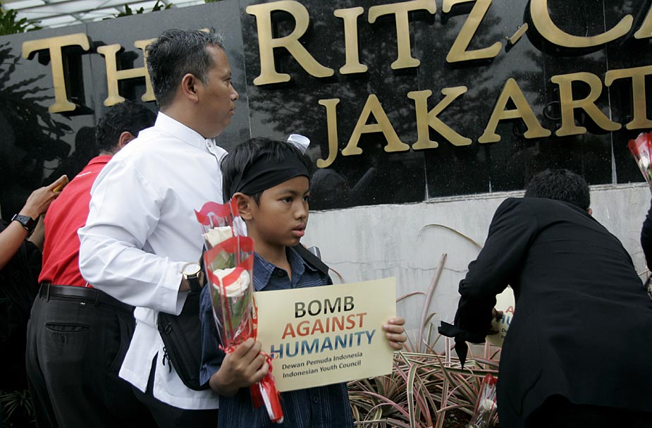 7月18日,印度尼西亞首都雅加達的民眾紛紛來到發(fā)生爆炸的萬豪酒店和麗嘉酒店,向死難者獻花表示哀悼。
