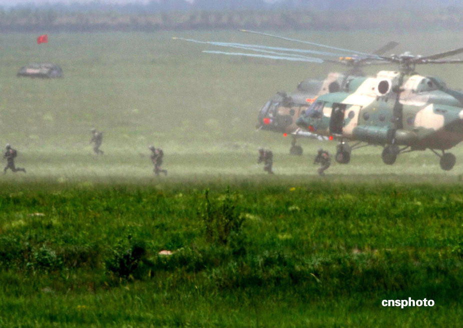 中國、俄羅斯兩軍總參謀長,7月23日上午到沈陽軍區(qū)洮南合同戰(zhàn)術(shù)訓(xùn)練基地,觀看“和平使命2009”聯(lián)合反恐軍事演習(xí)。雙方以陸軍和空軍為主,中方參演部隊(duì)包括1個(gè)陸軍戰(zhàn)斗群和1個(gè)空軍戰(zhàn)斗群。俄方參演兵力包括1個(gè)陸軍加強(qiáng)摩步營、1個(gè)空降突擊連和部分空軍兵力,雙方投入兵力兩千多人。中新社發(fā) 宋吉河 攝