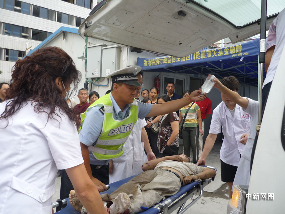 25日凌晨四點(diǎn)鐘左右,汶川縣境內(nèi)國道二一三線徹底關(guān)大橋被山上飛下來的巨石砸斷,已造成100米的橋面坍塌,7輛汽車受損,12人不同程度受傷,3人死亡,都汶路通行中斷。圖為汶川縣人民醫(yī)院正在積極搶救傷員。 汶新 攝