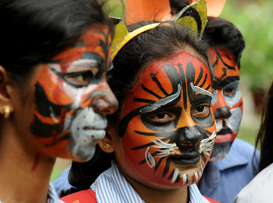 7月28日,約2000名學(xué)生在新德里化妝成老虎的臉譜,圍坐成老虎的造型,與官員和野生動物專家們一起呼吁人們保護(hù)孟加拉虎和其他野生動物。