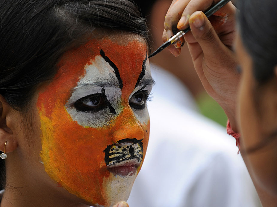 7月28日,約2000名學(xué)生在新德里化妝成老虎的臉譜,圍坐成老虎的造型,與官員和野生動(dòng)物專家們一起呼吁人們保護(hù)孟加拉虎和其他野生動(dòng)物。