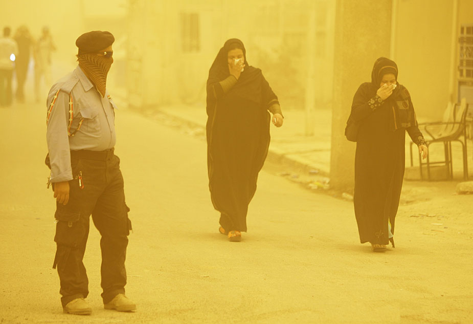 7月29日,伊拉克首都巴格達遭受沙塵暴襲擊。當地居民紛紛用各種物品保護住口鼻,以免吸入沙塵。