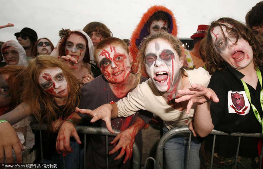 2009年8月6日,英國(guó)赫里福德郡Eastnor城堡,人們化裝成“僵尸”出現(xiàn)在大寒音樂(lè)節(jié)上,欲打破同一地點(diǎn)聚集最多“僵尸”的世界紀(jì)錄。