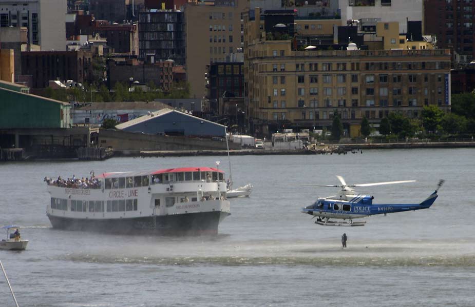 8月8日,紐約市曼哈頓西側(cè)的哈德遜河上空,一架觀光直升飛機和一架小型飛機相撞,兩飛機雙雙墜入河中。據(jù)稱觀光直升飛機上載有五名意大利游客和一名飛行員,而小型飛機上則有三人。圖為救援直升機在現(xiàn)場搜救。