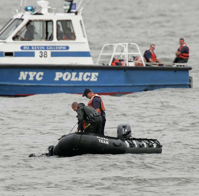 8月8日,紐約市曼哈頓西側(cè)的哈德遜河上空,一架觀光直升飛機和一架小型飛機相撞,兩飛機雙雙墜入河中。據(jù)稱觀光直升飛機上載有五名意大利游客和一名飛行員,而小型飛機上則有三人。圖為工作人員在現(xiàn)場救援。