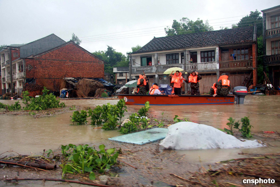 八月九日,武警官兵進入福鼎南墘村搶救受災民眾。受臺風“莫拉克”強降雨的影響,福建寧德福鼎南墘村大面積受淹,大水同時也將通往該村的道路全部淹沒,致使該村猶如“孤島”,該村近三百名村民被困。中新社發(fā) 王東明 攝