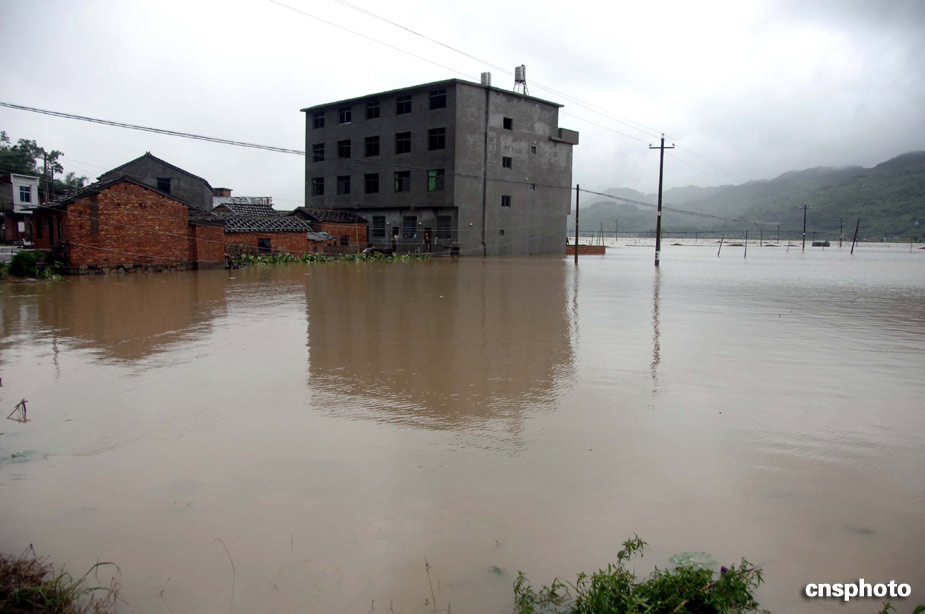 8月9日,第8號臺風“莫拉克”于16時20分在福建省霞浦縣沿海登陸,登陸時臺風中心最大風速12級(33米/秒),中心氣壓970百帕。由于受到“莫拉克”帶來的強降雨影響,霞浦洪山村內(nèi)澇嚴重。中新社發(fā) 王東明 攝