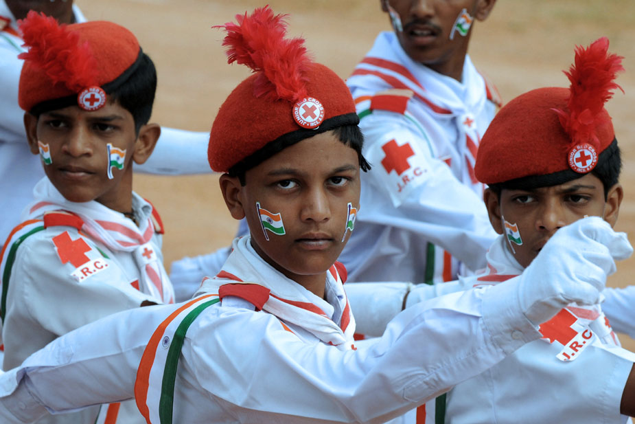 慶祝獨(dú)立62周年閱兵式上的印度童軍在做隊(duì)列表演。