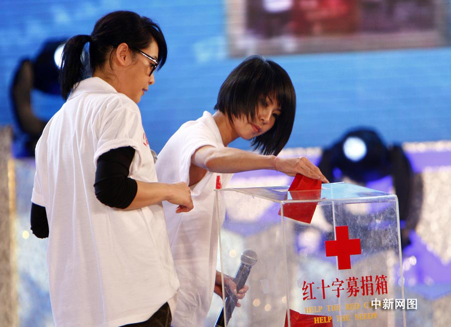 “跨越海峽的愛心”——大陸同胞援助臺灣“莫拉克”臺風受災同胞賑災晚會在北京舉行。眾多文體界明星在現(xiàn)場亮相,獻出一片愛心。圖為劉若英、許茹蕓在晚會現(xiàn)場捐款。 中新社發(fā) 杜洋 攝