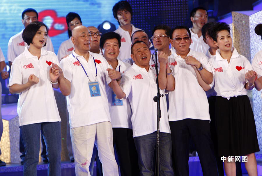 “跨越海峽的愛心”——大陸同胞援助臺灣“莫拉克”臺風(fēng)受災(zāi)同胞賑災(zāi)晚會在北京舉行。眾多文體界明星在現(xiàn)場亮相,獻(xiàn)出一片愛心。圖為侯耀華、潘長江等在晚會現(xiàn)場演出。中新社發(fā) 杜洋 攝